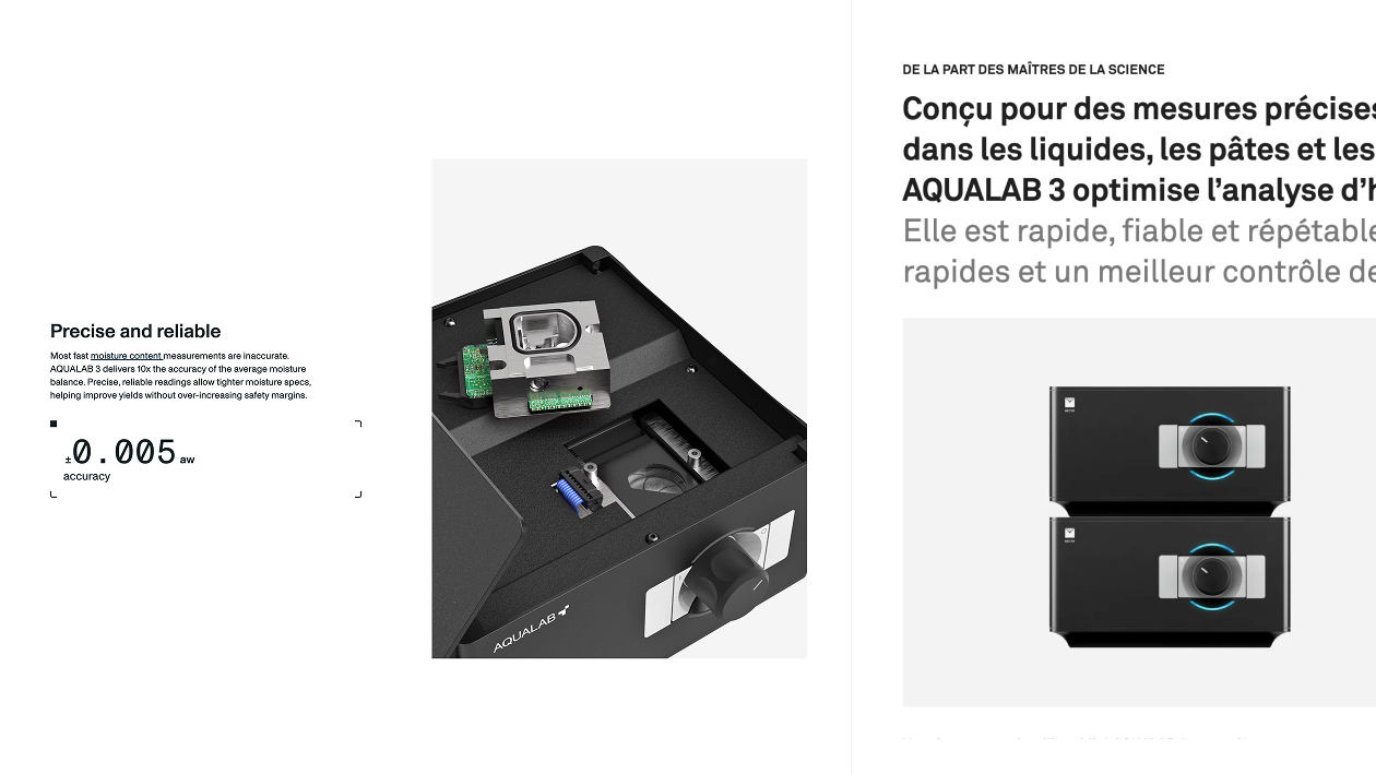 The AQUALAB 3 microsite served as a low-risk testbed for a new design system and multilingual strategy. Built with a static site generator, it delivered fast performance and actionable insights that shaped the broader AQUALAB website roadmap.
